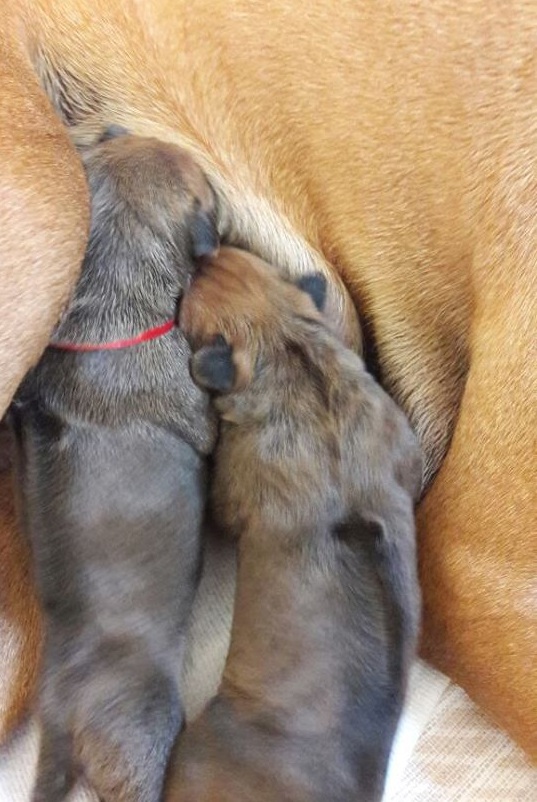 Dne 14. 4.2017 se nám narodila 3 štěňátka. První 2 standardní fenky (v 8:00 a 9:05) a jako poslední (v 9:50) nestandardní pejsek (posunuté korunky).